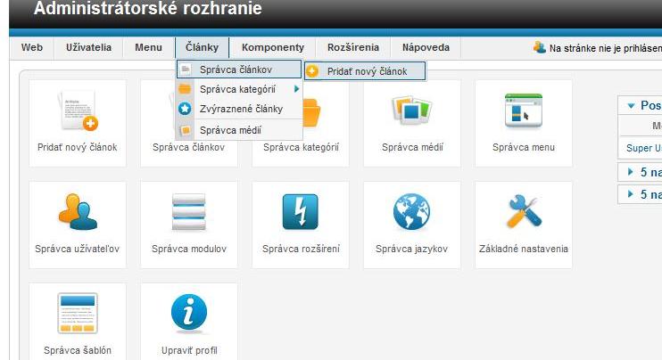 Máme 2 možnosti - buď klikneme vľavo na Pridať nový článok alebo zvolíme možnosť v navigácii Články - Správca článkov - Pridať nový článok.