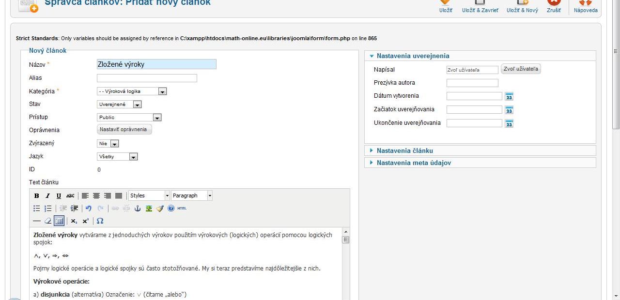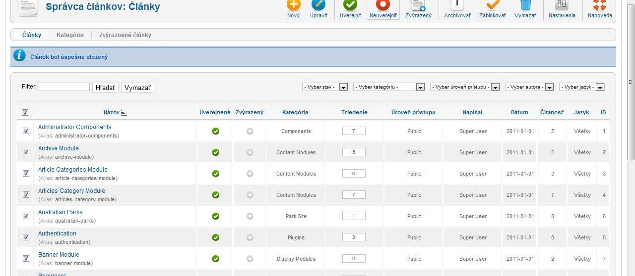 Klikneme na Uložiť a článok je uložený. Neskôr sa k nemu dostaneme v administrácii cez voľbu Články - Správca článkov, kde môžeme články aj hromadne upravovať.
